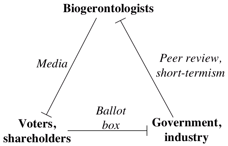 This "triangular logjam" is the fundamental obstacle to obtaining more money for life extension research.